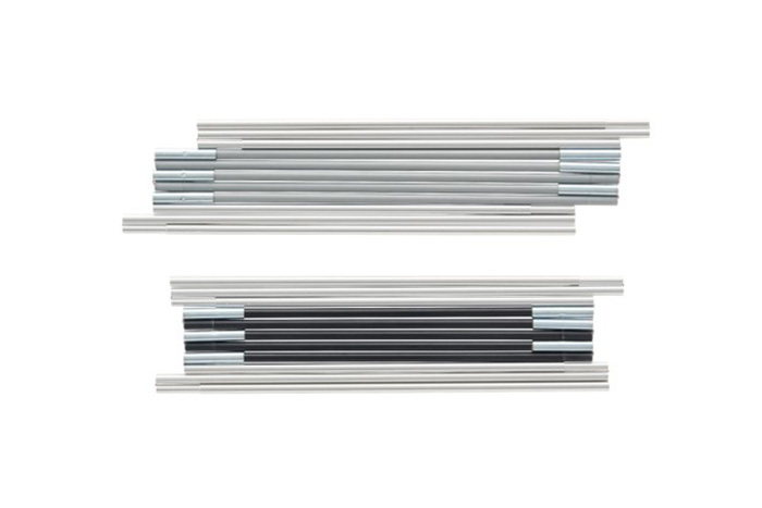 テントの骨組みとなるフレームには、異なる2つの素材を組み合わせた「ハイブリッド構造」を採用しています。しなやかさが求められる部分には、柔軟性に優れたグラスファイバー(湾曲部)素材を使用し、美しいテントの曲線を実現。