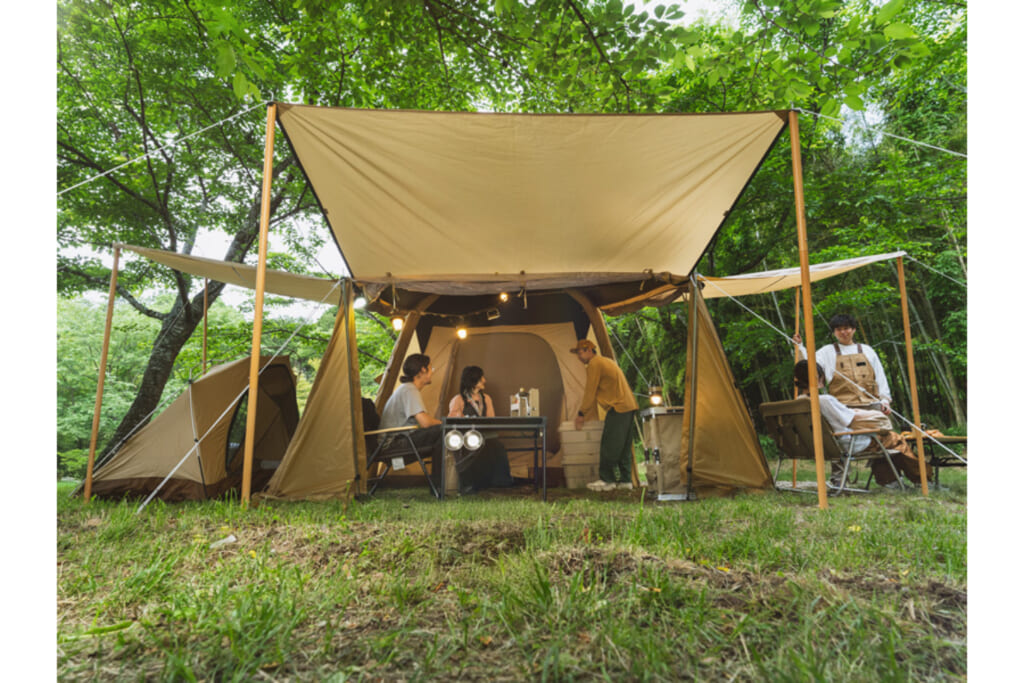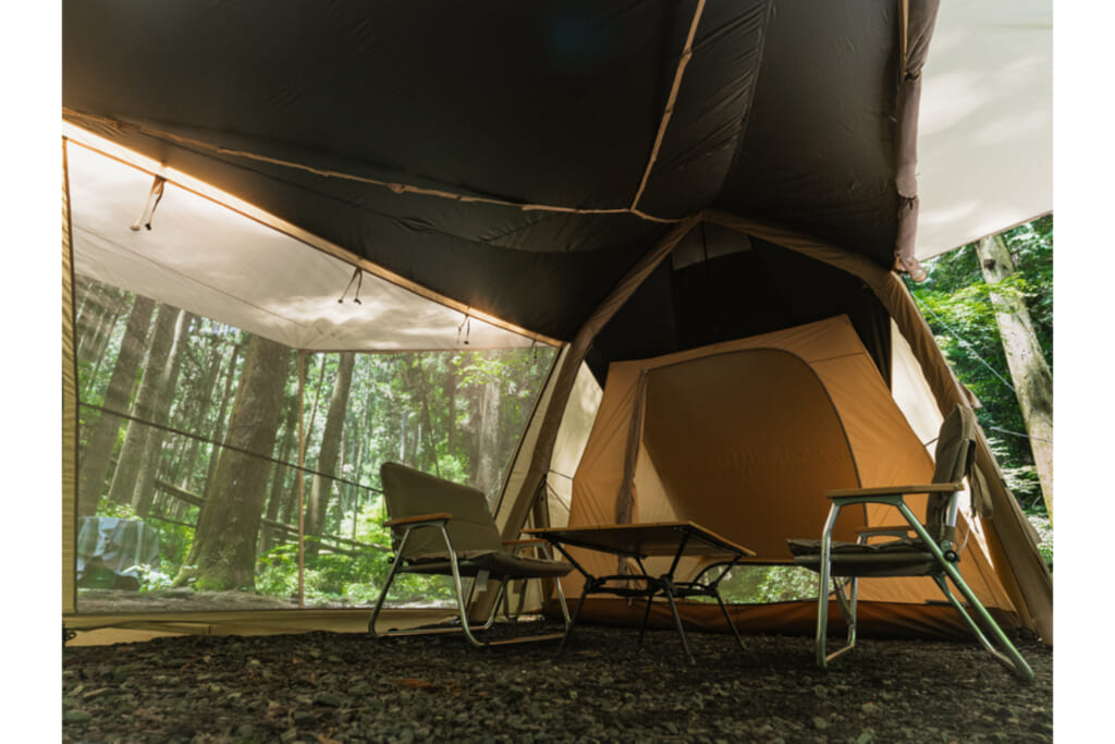 天井も高く、壁面が垂直に近く立ち上がるデザインにより、テントのすみずみまでデッドスペースが生まれにくいのが特徴。圧迫感のない大空間はまるで我が家のリビングのような心地よさです。夜になったら家族全員が入ってボードゲームを楽しんだりゆったりと食事をしたりと、テント内で快適に過ごせます。