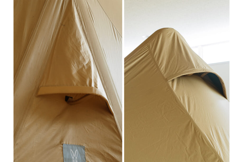 天井部分にはDOD独自の遮光ブラックコーティングを施し、真夏の日差しを強力にカット。側面は光を取り入れる仕様になっているため、暑さを防ぎながらもテント内は明るい絶妙なバランスを実現しました。効果的に空気の循環を生むベンチレーションも備え結露や湿気がこもりにくく、一年を通して快適なキャンプを楽しめます。