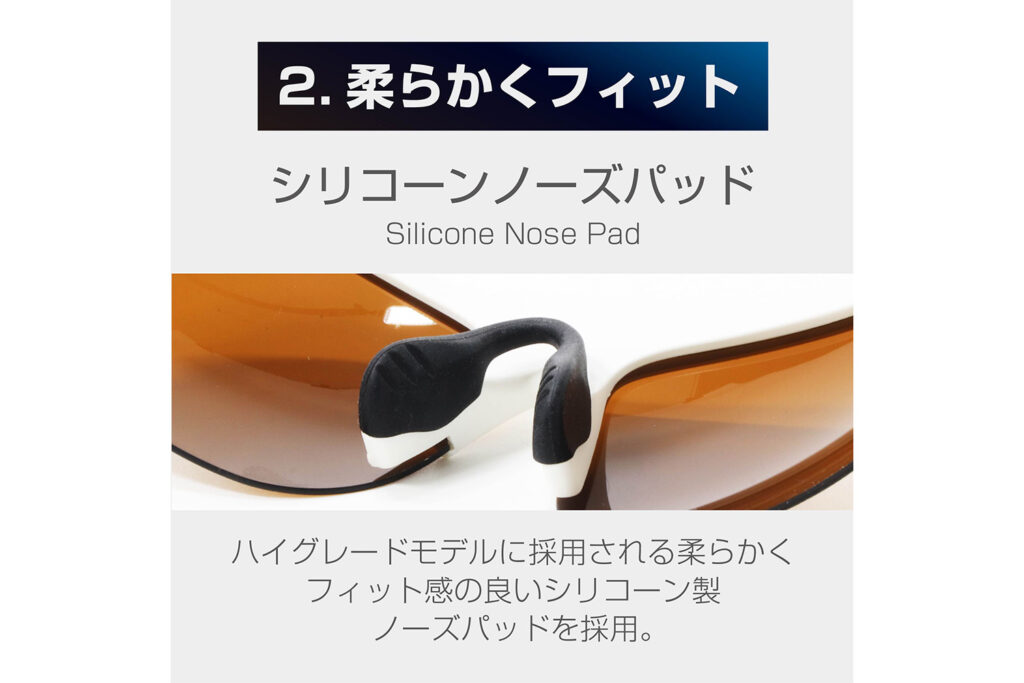 また、鼻当たり部分には、滑りにくく柔らかいシリコン製パッドを採用。高さを日本人向けに最適化したことで、まつ毛がレンズに触れにくく、長時間のトレーニングでも痛みや違和感を感じさせない設計となっています。
