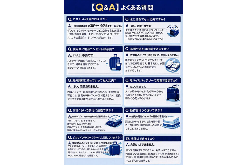 内蔵された強力なモーターが、みるみるうちにバッグ内の空気を排出し、衣類の体積を劇的にダウンさせます。「ボタンを押して、コーヒーを一口飲んでいる間にパッキングが終わる」。そんな魔法のような体験が、現実のものとなります。