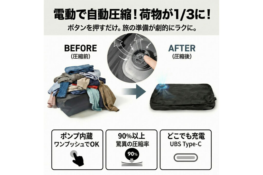 旅行や出張。本来なら「楽しみ」や「挑戦」への期待で胸が高鳴るはずのイベントですが、その直前には必ずと言っていいほど「パッキング」という名の試練が待ち構えています「冬物がかさばって、スーツケースが閉まらない」 「お土産を買いたいけれど、もうスペースがない」 「圧縮袋を使いたいけれど、掃除機を出すのが面倒。手巻き式は腕が疲れるし、すぐに空気が戻ってしまう」そんな、誰もが一度は経験したことのある「荷造りストレス」に、ついに終止符が打たれる日が来ました。