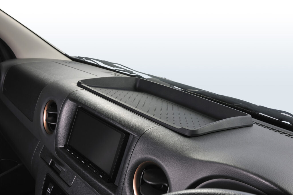 ダッシュボード上の広大な凹みを活用するこのトレーは、A4サイズのバインダーや書類が置ける約350×180mmのワイド内寸を確保。ティシューボックスや仕事の伝票、タブレットなどを整理するのに最適です。また、映り込みへの配慮としてマットブラックカラーとシボ加工により、フロントガラスへの映り込みを徹底的に軽減。さらに、置くだけの簡単設置により形状に合わせて置くだけでフィット。両面テープや接着剤を使わないため、車体を傷つけません。