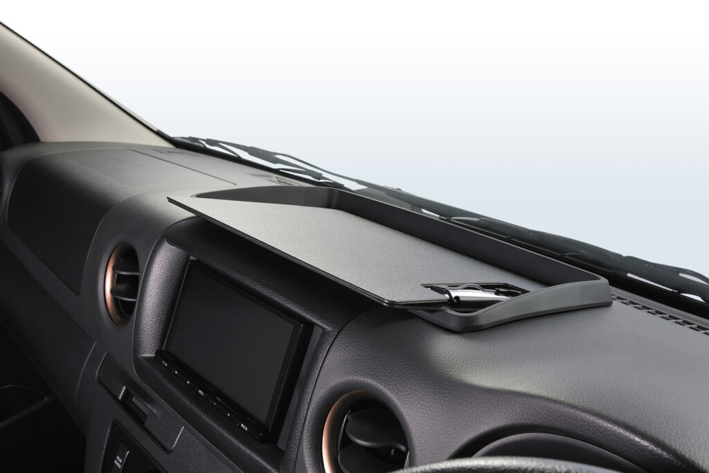 フロントシートの利便性を左右するオンダッシュとセンターコンソールのトレー。この2製品には、カーメイトのこだわりが凝縮されています。まず、「オンダッシュトレー(CX544K)」は仕事の効率を変えるワイド設計を採用。