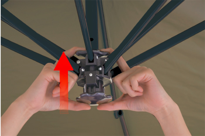 その影の「濃さ」は、一度体感すると戻れない快適さです。また、ラクラク設営のプッシュアップ式により、力の弱い方でもスムーズに設営できるよう、プッシュアップフレームを採用。さらに横幕が付属しているため、プライバシー確保や西日対策も万全です。
