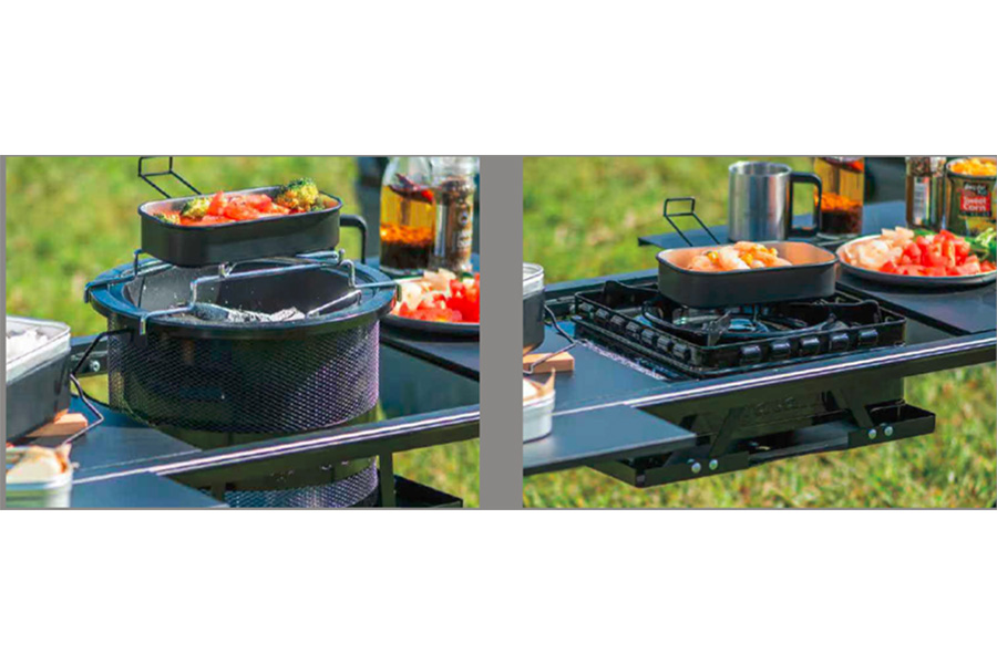 キャンプの楽しみの核となる「食」。それを支えるテーブルが、より多機能に進化しました。七輪からコンロまで、理想のキッチンを構築。「アウトドアシステムテーブル」(税込 9,980円)は、ハイカーやキャンパーの「自分ならこう使いたい」を形にしたアイテムです。自在な配置を可能にするお好みの位置に七輪やカセットコンロを落とし込みで設置可能。