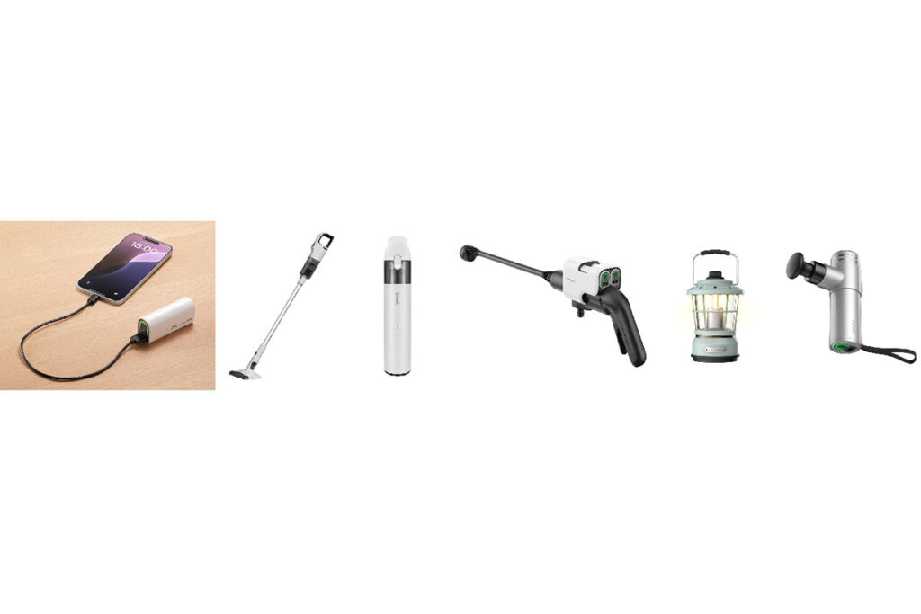 今回発売されるポータブル電源には専用の小型モバイルバッテリー「BH-U4」が2個付属しています。本体上部のスロットに差し込むだけで、ケーブル不要で充電が可能。この「BH-U4」は、スマートフォンへの給電はもちろん、同時に取り扱いを開始するLitheliブランドの家電5製品(クリーナーや高圧洗浄機など)の動力源としても機能します。