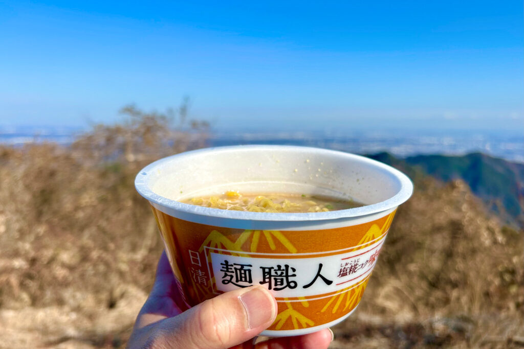 山登りの朝出発前に熱湯をボトルに注ぎ、お昼前に山頂のベンチでボトルを取り出し蓋を開けると、湯気が出ていました。おおっ! 良い感じです。素早くカップ麺にお湯を注ぎ、ジッと待つこと4分間。写真では上手く見えませんが、肉眼では湯気が出てました。
