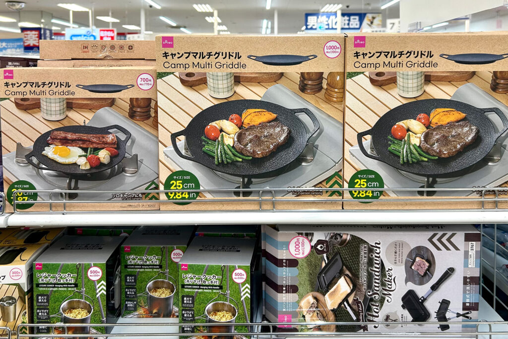まずレジャー用品コーナーで大量展示されていたのが、「キャンプマルチグリドル20cm 」(税込770円)と「キャンプマルチグリドル25cm」(税込1,100円)です。20cmはソロキャンプに、25cmならカップルやファミリーでも使かえるアイテムです。直火、炭火、IHでは使えませんが、カセットコンロはOKです。油をひいて炒め物などをキャンプでの調理が手軽に楽しめます。
