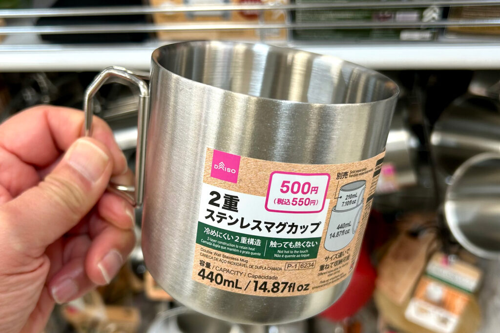 軽アイテム。木炭もダイソーで売っているのでセットで購入すればすぐに炭火焼きパーティーがで楽しめます。他にも、ダイソーの「2重ステンレスマグカップ440ml」(税込550円)もキャンプで活躍してくれるお役立ちアイテムです。2重構造を採用しているので触っても熱くなくて、冷たい飲み物が冷めにくいのが特徴です。別売りの210mlのカップを購入すればサイズ違いでスタッキングが可能。重ねて持ち運べるのも◎です。