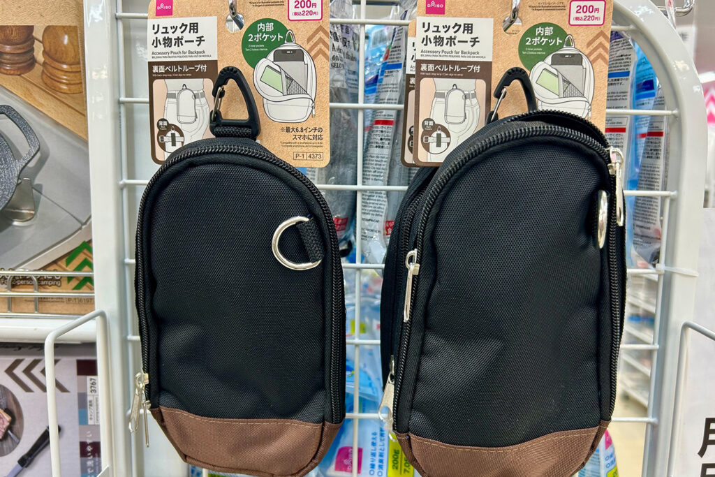キャンプの調理で調味料を軽量したり、ソースを入れておくなど、便利に使える「ミニステンレスシェラカップ2個」(税込110円)もオススメです。呑んべいの筆者はウイスキーでハイボールやカクテルを作る時に軽量カップの代わりとして使っており意外と使えるミニカップです。その他、「リュック用小物ポーチ」(税込220円)は携帯やライターなど、ちょっとした物をキャンプ時に入れておくと便利です。
