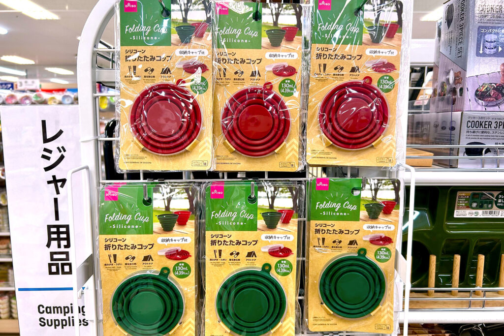 シリコーン折りたたみコップ110円も小さくたためてキャンプで使いたい時にコップにできる便利品です。収納キャップ付のシリコーンコップは定番アイテムとして長くダイソーのレジャー用品売り場で陳列されている隠れた名品です。