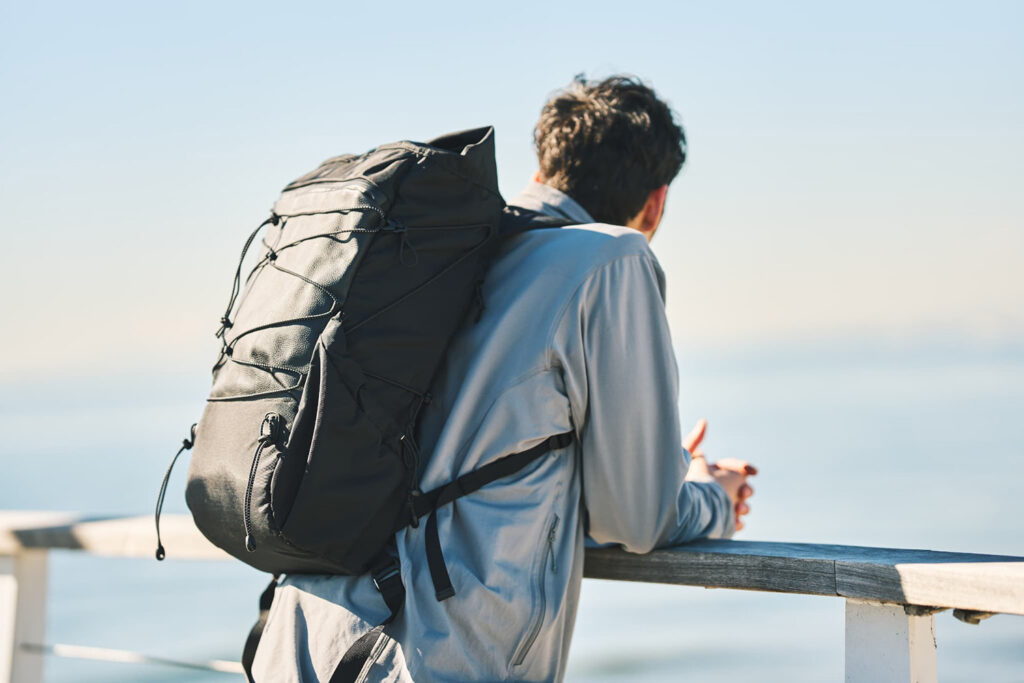単に数値が軽いだけではありません。「THE Walker」は背負うほどに楽になる設計が施されています。 本格的な登山ザックに見られる「ハーネス」と「腰ベルト」の構造を、街歩きに最適なバランスで再構築。肩だけでなく腰回りで荷重を支えることで、長時間の移動でも疲れを感じさせない“無重力感”を演出します。