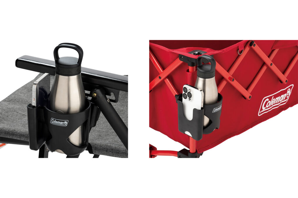 これまでのカップホルダーは文字通り「カップ(飲み物)」を置くためにあり、現代のアウトドアライフにおいて、スマートフォンは地図を確認し、写真を撮り、音楽を流すための不可欠なツールです。コールマンが今回リリースした「カップホルダー」の最大の特徴は、ドリンクとスマートフォンを同時に、かつスマートに収納できる点にあります。