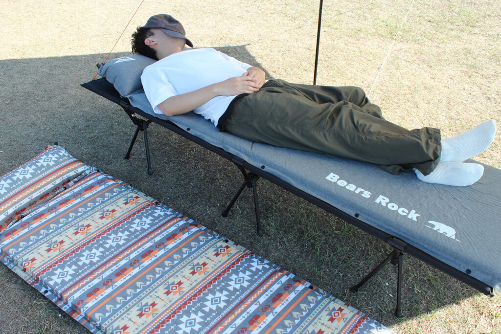 まず断熱性は、地面からの冷気を遮るのに十分な空気を確保。安定性については、厚すぎると体が浮いたような不安定さを感じ、寝返りが打ちにくくなることがありますが、5cmは体を面でしっかり支えます。また、キャンプだけでなく車中泊や自宅の来客用、さらにはコット(キャンプ用ベッド)との併用にも最適なサイズ感となっています。
