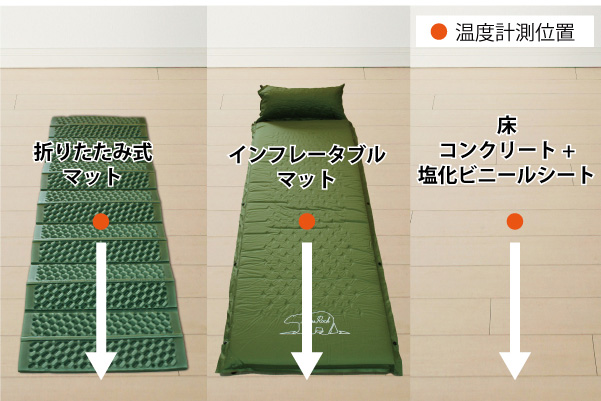 Bears Rockでは、2月の厳寒期(床温度0℃)に比較検証を実施しました。①床に直接寝る / ②折りたたみ式(銀マット等)マット / ③Bears Rock インフレータブルマット5cm。この3パターンで背中の温度を計測したところ、最も暖かさを維持できたのが「インフレータブルマット5cm」でした。