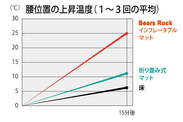 Bears Rockでは、2月の厳寒期(床温度0℃)に比較検証を実施しました。①床に直接寝る / ②折りたたみ式(銀マット等)マット / ③Bears Rock インフレータブルマット5cm。この3パターンで背中の温度を計測したところ、最も暖かさを維持できたのが「インフレータブルマット5cm」でした。