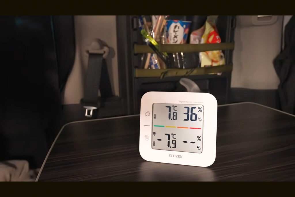 冷え込みを見越して寝具や防寒着を手の届く場所に寄せて、電源や暖房まわりも整えて一息つきます。道の駅で買った夕食をいただいたあと気温をチェックすると、外気温はマイナス6.9度! 車内は12.5度でした。