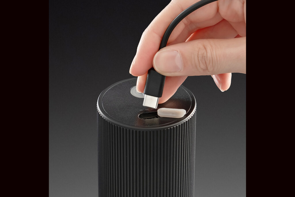 また今回のリニューアルでバッテリー残量が一目でわかるメモリ表示が搭載されました。本体天面のメモリ表示で残量がどれくらいあるか一目で分かります。外出先での突然の電池切れも防ぎやすくなります。充電はUSB Type-Cを採用し、約3時間の充電で連続20~30回程度使用できます。出かける前に充電しておけばキャンプ中も十分に使えそうです。