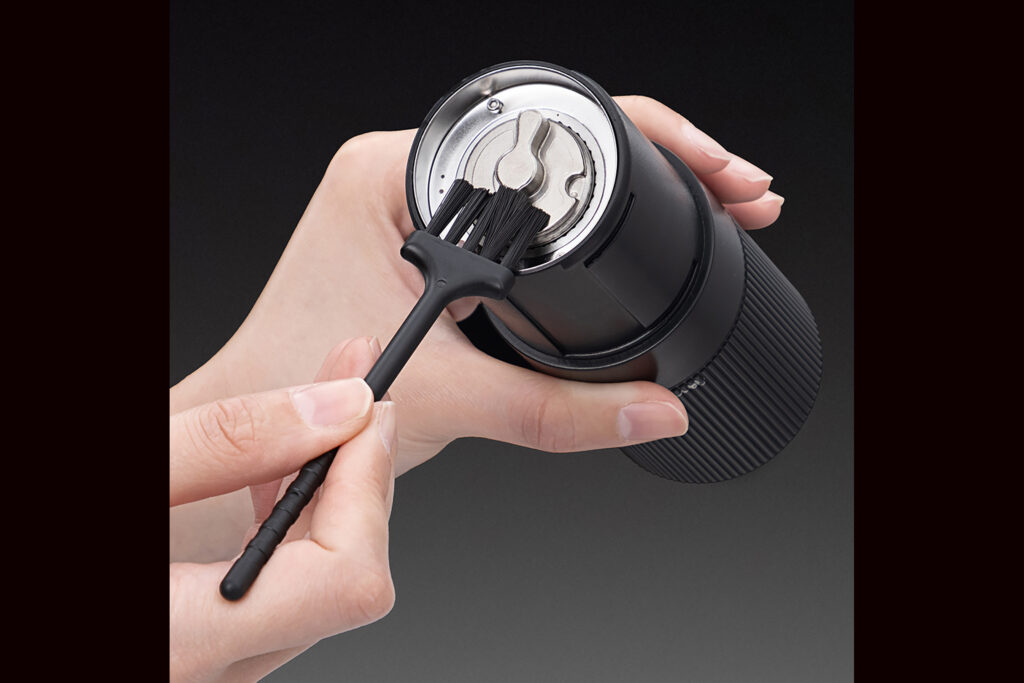 操作方法は簡単です。まずユニットにコーヒー豆を入れ、パウダーカップを取り付けます。伸縮式になっているカップを伸ばし、天面のスイッチを押すだけでOK。使い終わったら付属の掃除用ブラシで、グラインディング部分を掃除します。直下式構造のため掃除も簡単です。