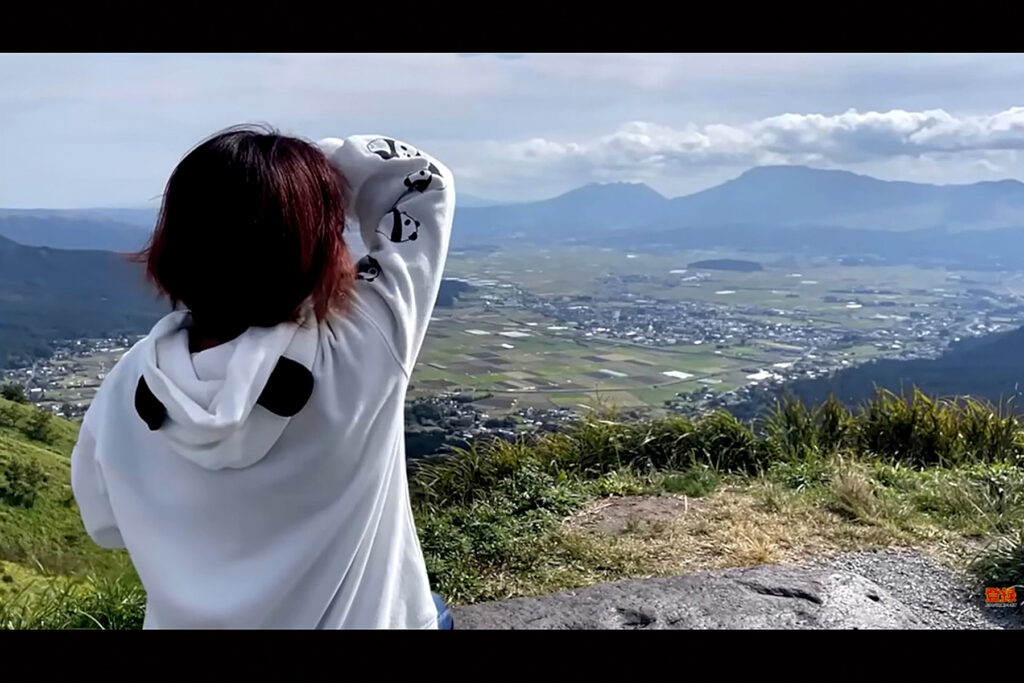 車はまず阿蘇の大観峰をめざします。ゆるやかなカーブをのぼっていくたび、どんどん開けていく景色。目の前の道路と風景を映し出す臨場感たっぷりのカメラワークで、見ているこちらもワクワクと気持ちが高まります。