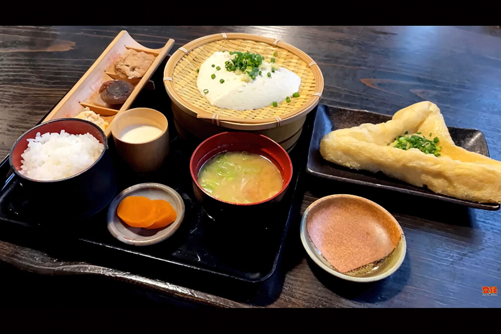 途中休憩で車を降りると眼下には広い草原や遠くの山々まで一望できる壮大なパノラマビューが広がります。思わず深呼吸したくなる絶景です。そして阿蘇スカイラインを抜けると、旅の目的地・小国町に入りました。 さっそく「岡本とうふ店」にて腹ごしらえです。注文したとうふ定食は、ざる豆腐や大きなふわふわの生あげなど豆腐づくし。一口食べて思わず「ウマ」と声が出ます。