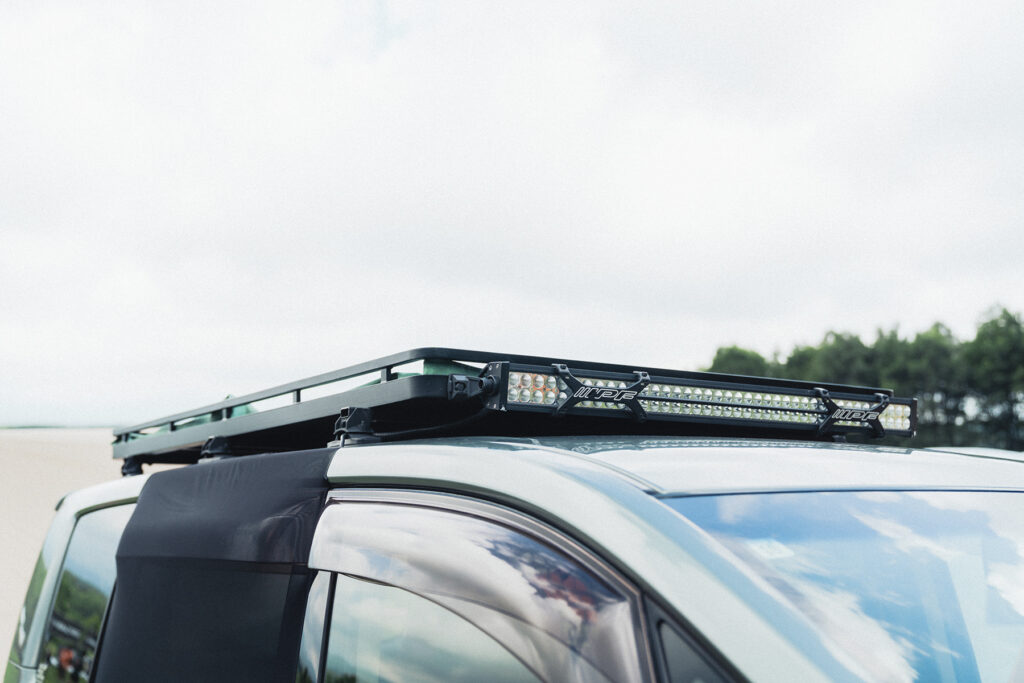 もうひとつの自慢ポイントはルーフラック。今でこそアフターパーツメーカーのラインアップが充実していますが、クルマを購入したばかりの頃は実用的でカッコいいデザインが少なかったので、何とワンオフで製作しました。こだわりは定番の丸パイプではなく角パイプを使用した点で、特にコーナーの部分の美しい曲げ加工に注目してください。足まわりをリフトアップしているため車体と水平になるようフラットに製作し、ベースキャリアのフット部分も詰め加工して極力全高を抑えています。