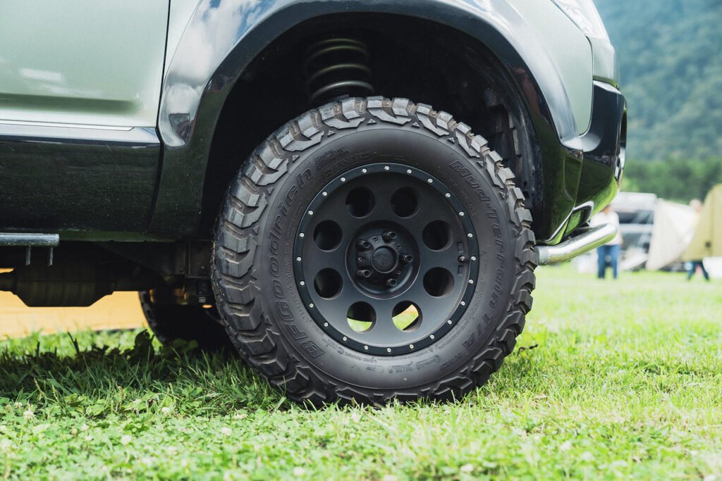 ホイールは昔から四駆界では王道とされているソリッドレーシングのレンコン風ディッシュデザインを選んでいます。タイヤはBFグッドリッチのマッドテレーンを選び、オフロードでの走行性能を高めました。