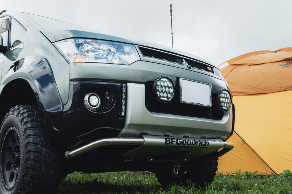 フロントまわりにランプを追加するのも、四駆界では定番のカスタムです。昔からラリーを得意としてきた三菱のサポートカーをイメージして、開口部に大きなLEDランプを装着しています。フロントバンパーの縦に長いダクト部分にはLEDデイライトをインストール。