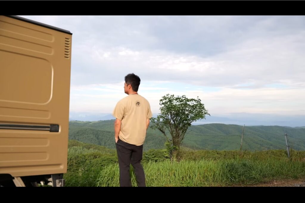 夜が明けると高原の景色は一変して、朝もやに包まれていました。流れる霧の中の風車に、霞がかった遠くの山々。どれも高原で朝を迎えたから見られる景色ですよね。車の外に出て鳥の声や風の音を聞き、やわらかな朝日を浴びてから朝食の支度にとりかかるゆうやさん。