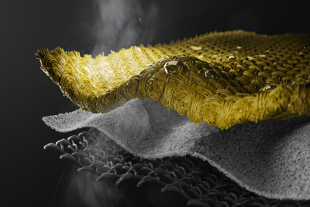 空孔率約80%の均一な薄膜構造により、完全防水を維持しながら着用直後からムレを逃がしやすい設計を実現。ポリプロピレンは高い疎水性と軽さを持ち、加水分解しにくく長期使用にも適しています。