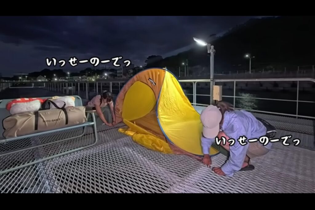 テントを設営するYoutubeチャンネル『バチ抜けチャンネル【初心者釣りガール】』のバチ抜けさんとお友達のまるさん