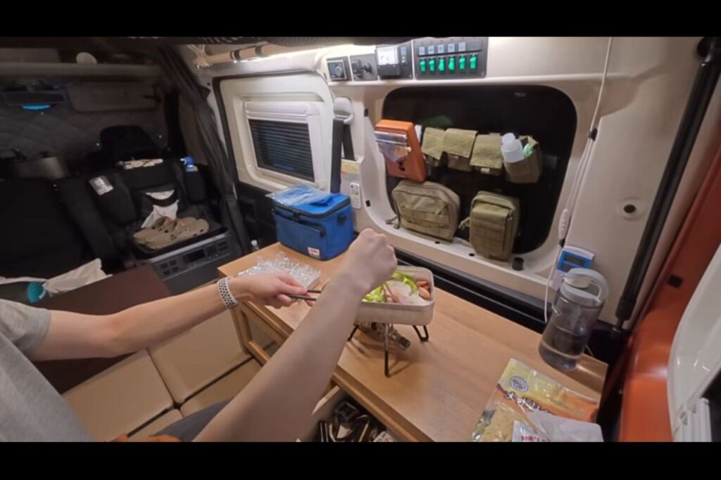 到着したのは、数台の車が停まる静かなスポット。オレンジの軽自動車の扉を開けると、フラットにしたシートの上にマットを敷き、棚やラジオを設置していきます。すると、まるで小さなリビングのような空間が完成しました。窓には網戸が取り付けられており、虫よけスプレーを吹きかけながら丁寧に窓枠を拭く姿も印象的です。