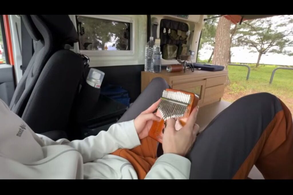 朝、窓の外には海と緑、そしてやわらかな光。気温20度ほどの心地よい空気の中、ガスバーナーでお湯を沸かし、温かいドリンクを片手に外の景色を眺める贅沢な時間が流れます。さらに、親指ピアノ「カリンバ」で『テルーの唄』を演奏。穏やかな音色が朝の空気に溶け込み、心安らぐひとときが流れます。