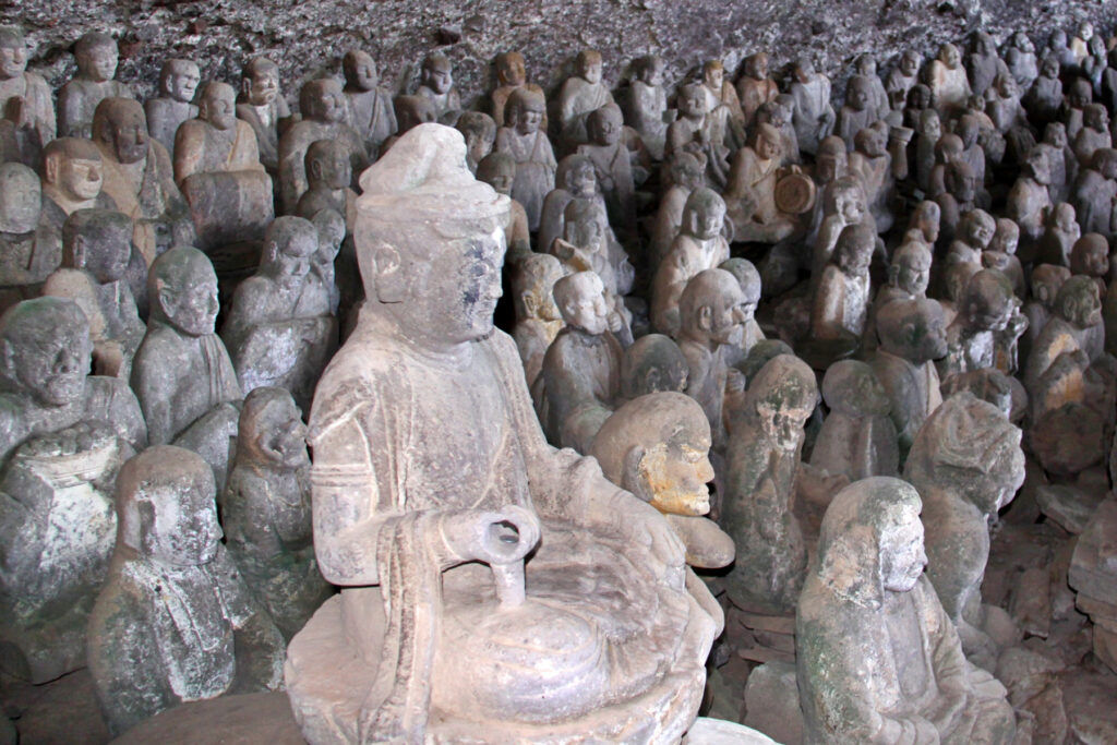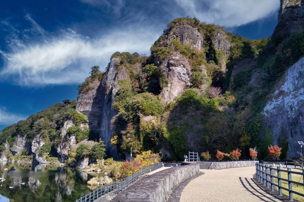 耶馬渓の大きな特徴は自然の絶景のなかに人の営みが色濃く刻まれていることです。岩山に抱かれるように建つ「羅漢寺」には日本最古の石造五百羅漢像をはじめ、多くの石仏が残されています。「青の洞門」は禅海和尚が30年余りをかけて掘り進めた、手彫りのトンネルとして知られています。ノミの跡を今に残す岩肌の先には、耶馬渓を象徴する景観が広がります。