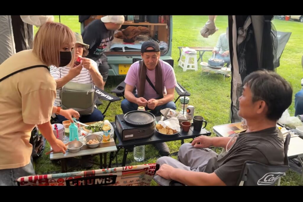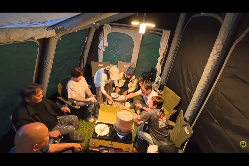無事に設営を終えた後は、北海道のメンバーとの交流会、そして夜の宴を満喫。それぞれが自由に食材を焼き、お酒を酌み交わす。そんなゆるやかで温かい雰囲気が画面越しにも伝わってきます。