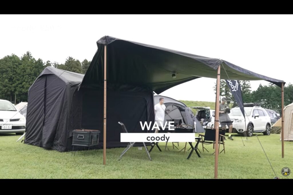 coodyの「WAVE」も同じく空気で設営可能。本体とタープを簡単に連結できるのが魅力です。Familiaに比べて小ぶりながらも、壁が直立しているため有効スペースが多く、快適な室内空間が完成。デメリットはどちらも収納時の大きさと重さで、持ち運びや積載には注意が必要です。