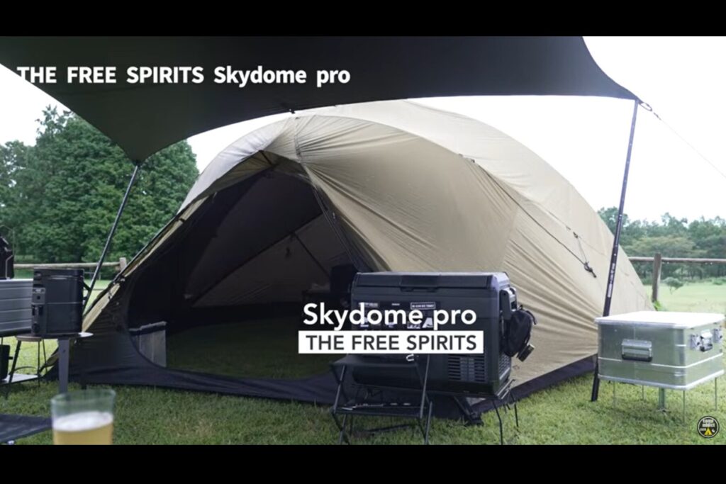 THE FREE SPIRITSの「Skydome pro」は、450cm角のドーム型テント。4面がメッシュになるため風通しがよく、夏も快適に過ごせます。一方、ドーム形状ゆえに隅の有効スペースが少し限られる点がデメリットとして挙げられました。