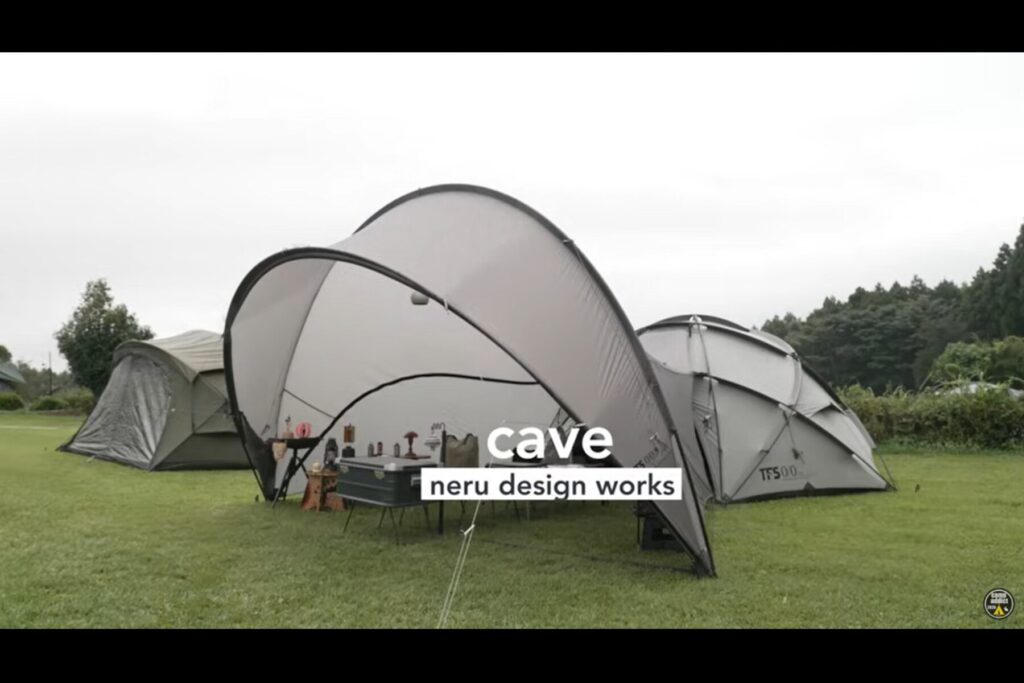 neru design worksの「CAVE」は、ファミリーキャンプのニーズに合わせて前室を設けることで広さを確保。ポールを通す際に少し力が必要ですが、設営後の珍しいフォルムが目を引く美しいテントです。