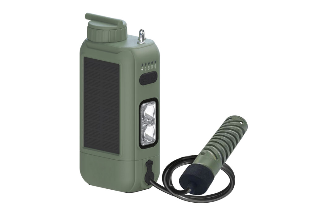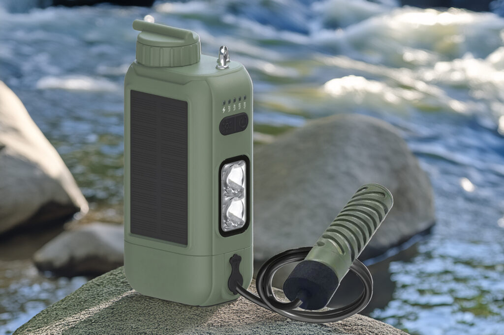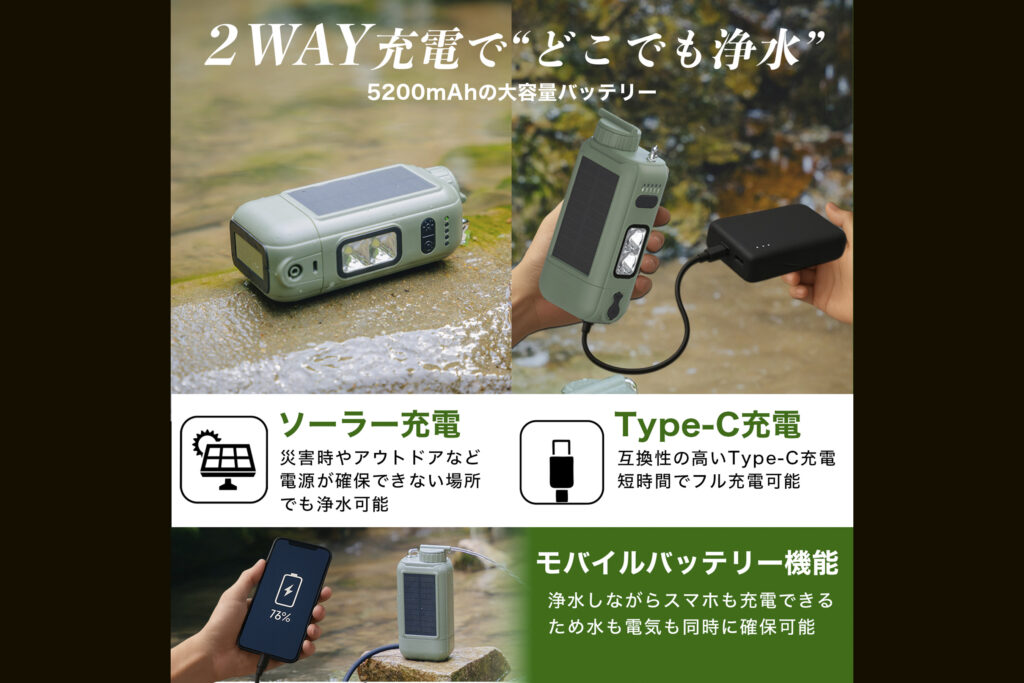 浄水機能に加え、電源の確保が難しいアウトドア環境下での「自立性」の高さも見逃せません。本体には5200mAhのバッテリーを内蔵し、USB Type-Cによる充電のほか天面のソーラーパネルによる補助充電にも対応。さらに、このバッテリーからスマートフォンなどへ給電するモバイルバッテリー機能も備えています。