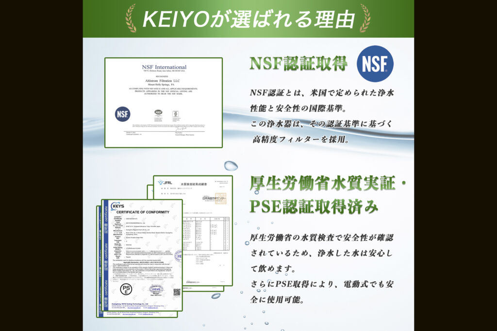 バクテリアや原虫類に対して99.9999%の除去率を誇りながら、水に含まれる天然ミネラル分はそのまま残すのも大きな特徴。これにより安全性を確保しつつも、自然の水の美味しさを損なわない工夫がなされています。公衆衛生の国際規格であるNSF認証に加え、厚生労働省が定める国内の水質基準にも適合済み。日本のフィールドで川水や雨水を浄化して使用する際も、確かな安心感を与えてくれます。