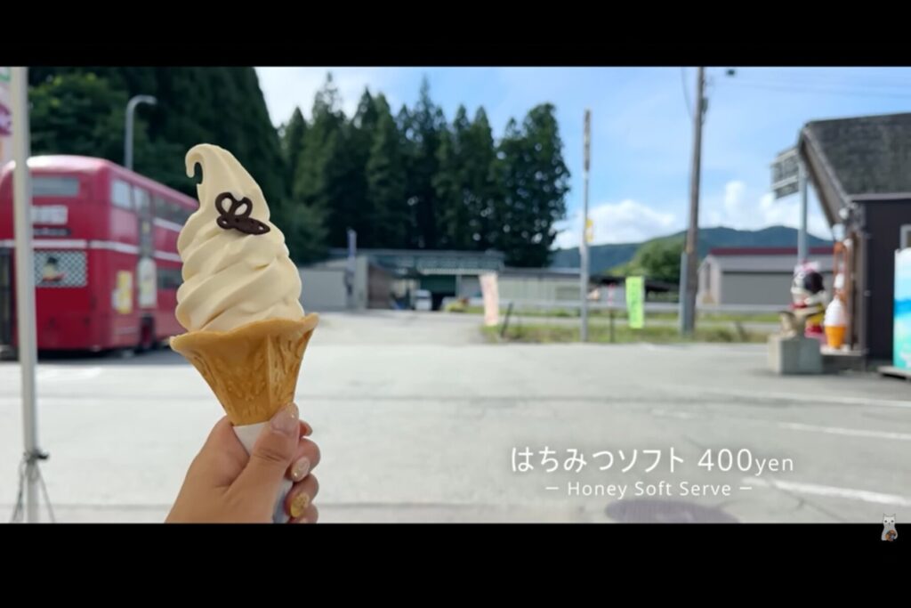 途中、お母さんおすすめの「山のはちみつ屋」に寄り道して、はちみつを調達。多種多様なはちみつが並ぶ店内では、希少な日本みつばちのはちみつも発見しました。買い物の後は「はちみつソフト」を食べて至福のひととき。心身をリフレッシュさせてから、いよいよ本日の目的地である玉川温泉を目指します。