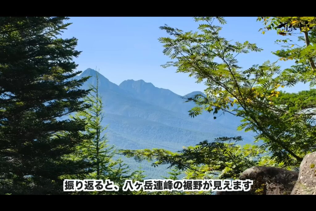 登り進んでゆくと笹の道が終わり、岩のゾーンが始まりました。苔むした岩々を踏み越えていきます。標高2110m地点で振り返ると、そこには素晴らしい景色が。八ヶ岳連峰の裾野も見ることができます。