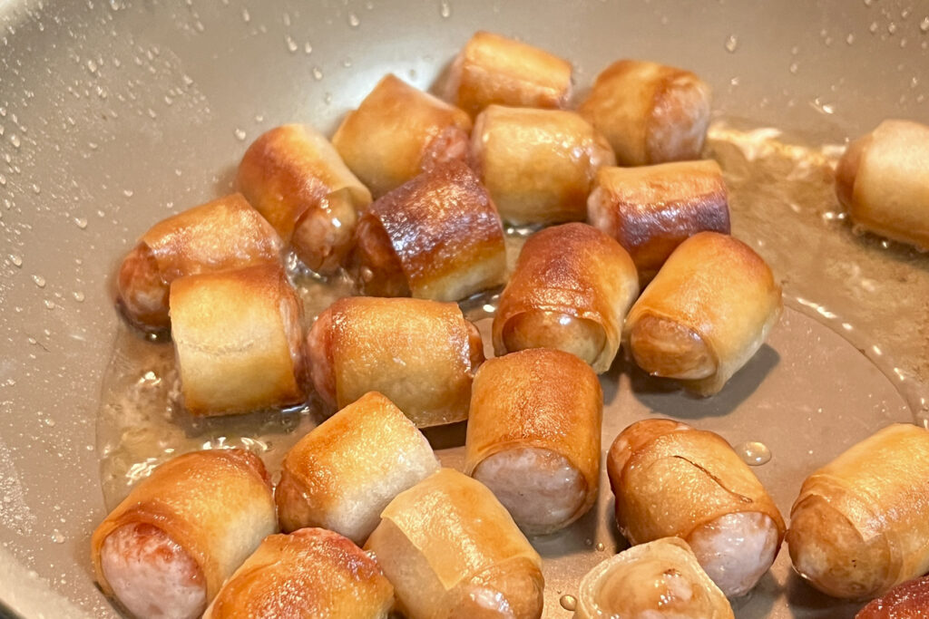 アウトドア料理としていまSNSでも人気を集めているのが、ソーセージ(ウインナー)に春巻きの皮を巻いて揚げたおつまみレシピ「バリバリソーセージ」。外はパリパリ、中はプリプリのクセになるおいしさです。春巻きの皮をソーセージに巻いたら、食べやすい大きさにカットしてフライパンで揚げ焼きに。皮がきつね色に揚がったら、塩とあらびきコショウで味つけするだけで完成です。