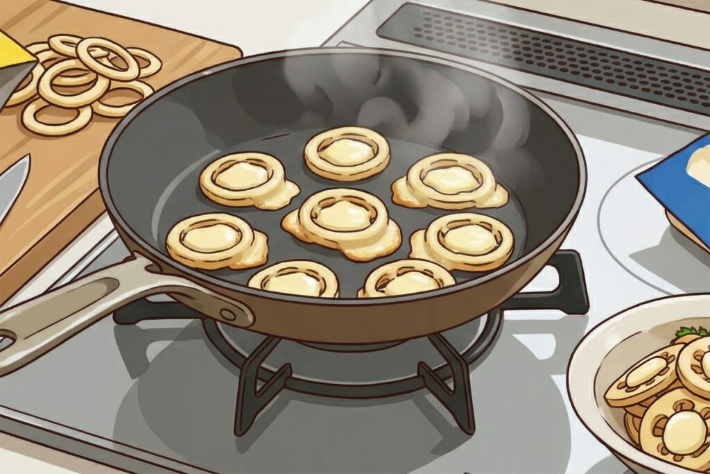 簡単にできると話題なのが「さけコ」。リング状のポテトスナック「ポテコ(東ハト)」と「さけるチーズ(雪印メグミルク)」を使ったレシピです。「ポテコ」の穴に「さけるチーズ」を通し、「ポテコ」の大きさに合わせてカットしたら、フライパンで両面をこんがりと焼くだけ。