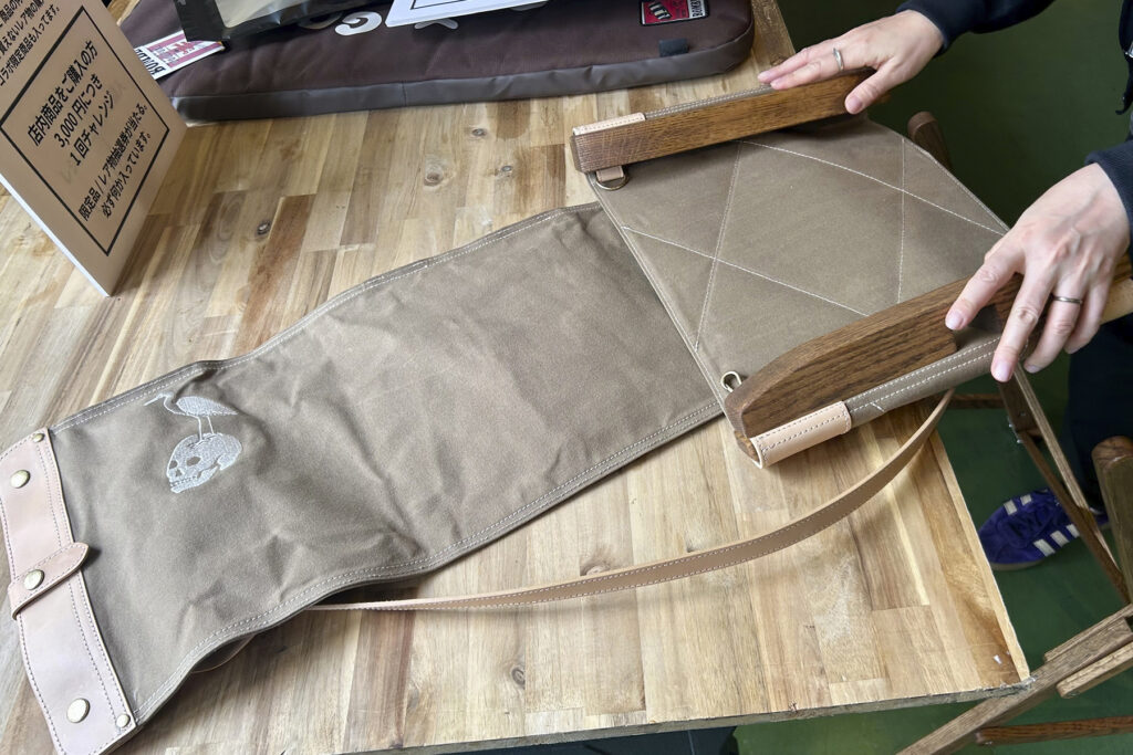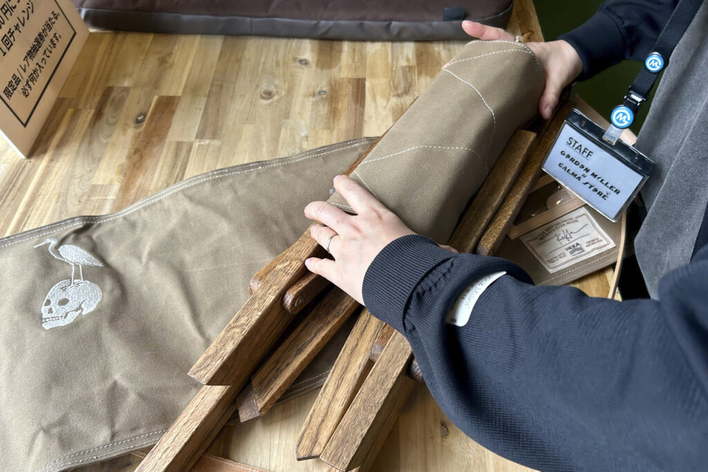 バンライフの限られたスペースでも気軽に持ち出せるコンパクトさが、このチェアの大きな魅力のひとつ。収納袋にはコラボのアイコン、スカルとアマサギのオリジナルグラフィックもお洒落。座面には老舗・富士金梅の帆布が贅沢に使われており、使うほどに風合いが増していきます。