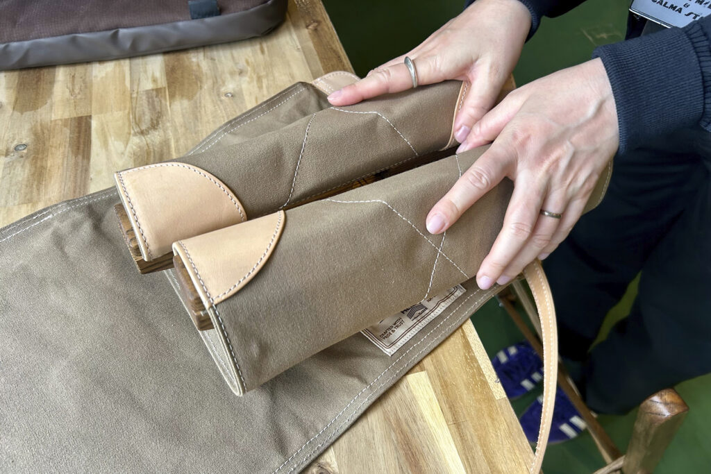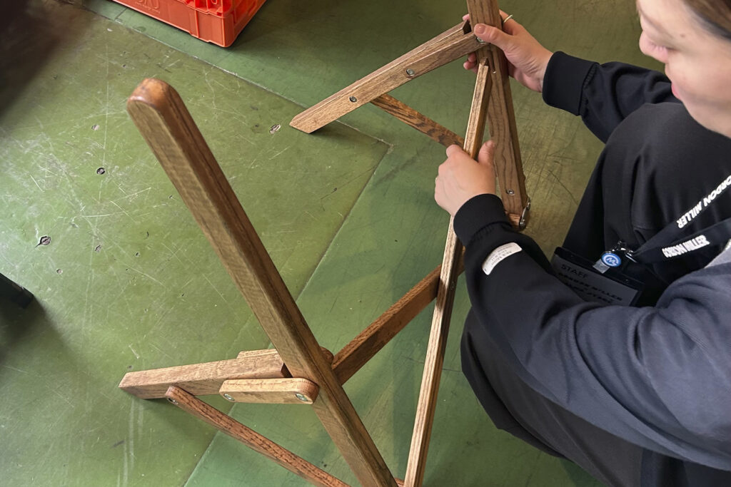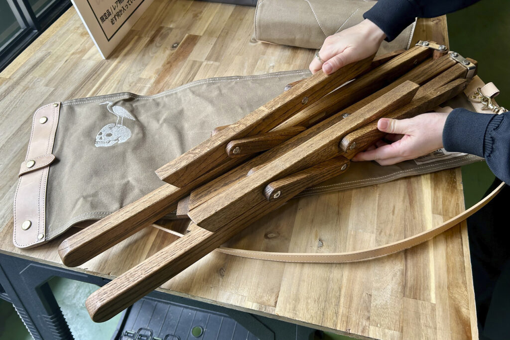 北米産OAK材を組んで設営するヘカチェアですが、収納もじつに手軽です。今回は実際に設営されていたヘカチェアを収納袋に入れてみました。座面を持ち上げて外したら小さくまとめ、接続穴のパーツを外してたたみます。簡単に小さくなるので本体と座面を合体させて、背もたれとしても機能する収納袋に入れていきます。
