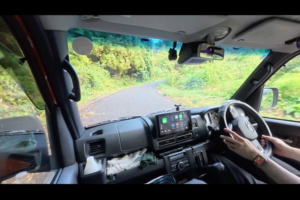 Youtubeチャンネル「Dentan」の動画「軽自動車と山で独りぼっちの車中泊」で緑豊かな山道を運転するシーン