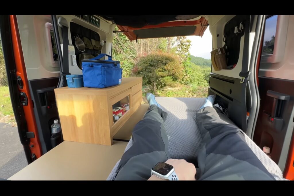 誰もいない山中に到着。虫よけスプレーを身体にかけたら、軽自動車の座席を倒してフラットに。その上にはエムールのマットレスを設置し、机代わりにもなる収納豊富なISSEIKIのテレビボードを横に並べれば、あっという間に快適に過ごせる秘密基地の完成です。DJIのポータブル電源も、蚊取り線香や炊飯器の電源として大活躍。