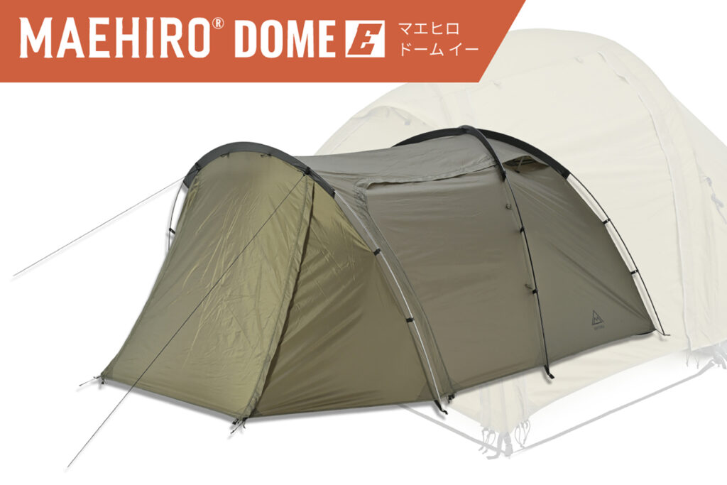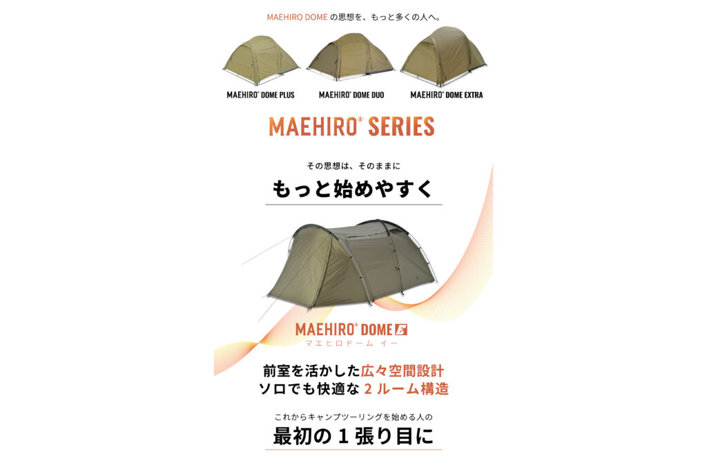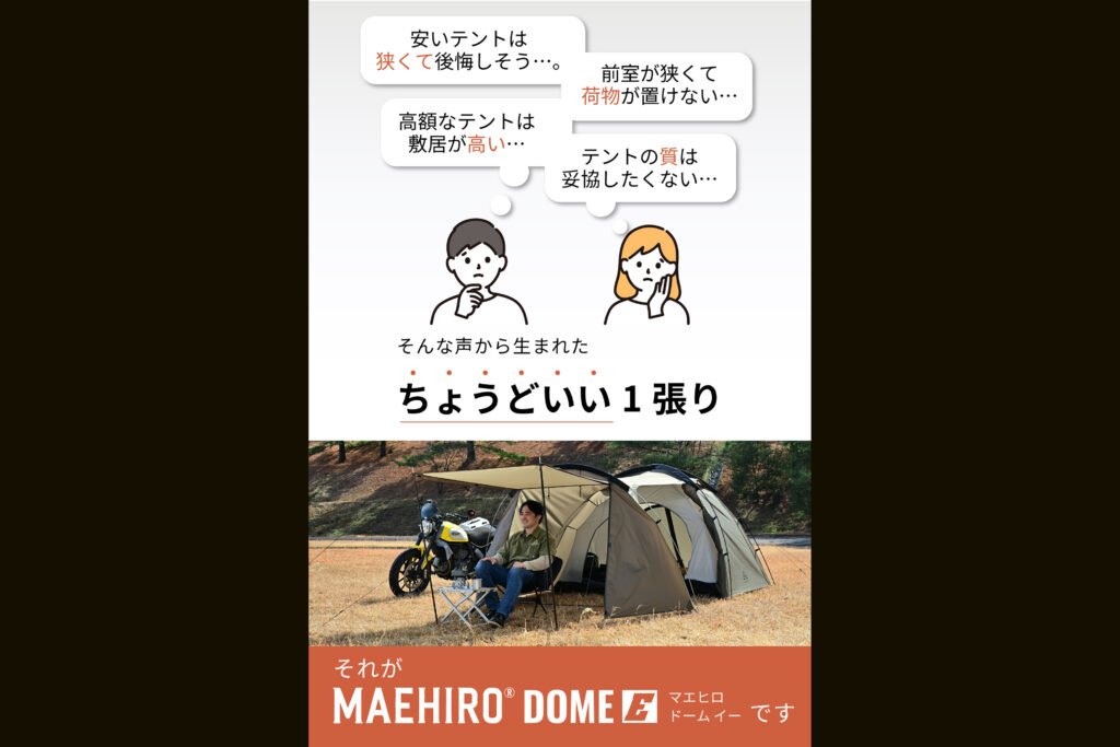 新製品の「MAEHIRO DOME E」はツーリングキャンプ初心者の「最初のひと張り」に最適な価格設定を実現。製品名の「E」にはEconomy、Entry、Easy、Essentialの4つの頭文字と「イイ(E)ね」という期待が込められています。